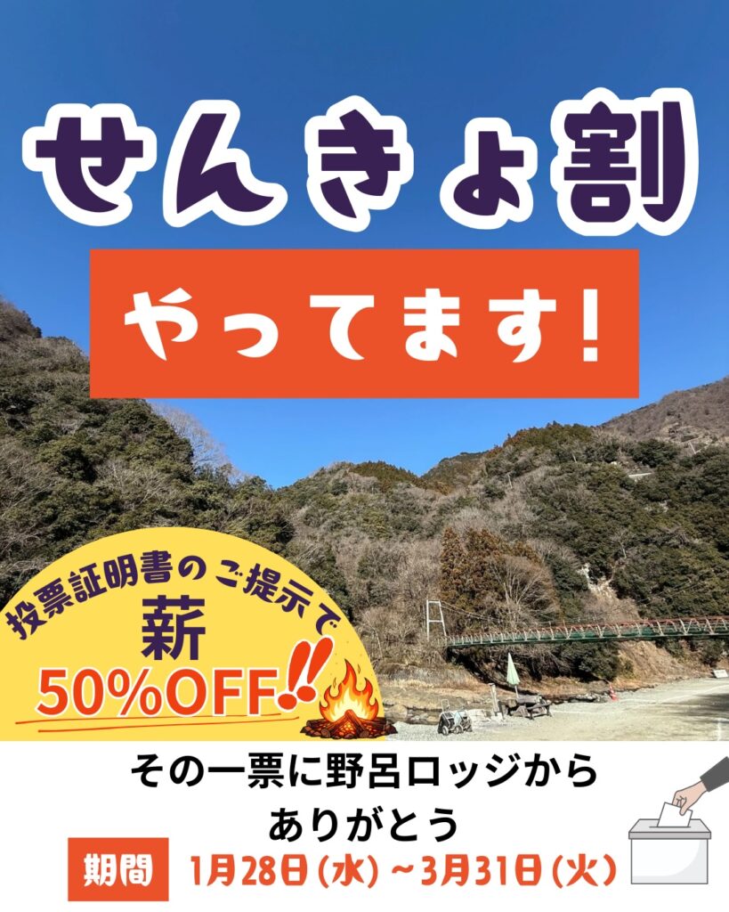 野呂ロッジキャンプ場では「せんきょ割」を実施します!