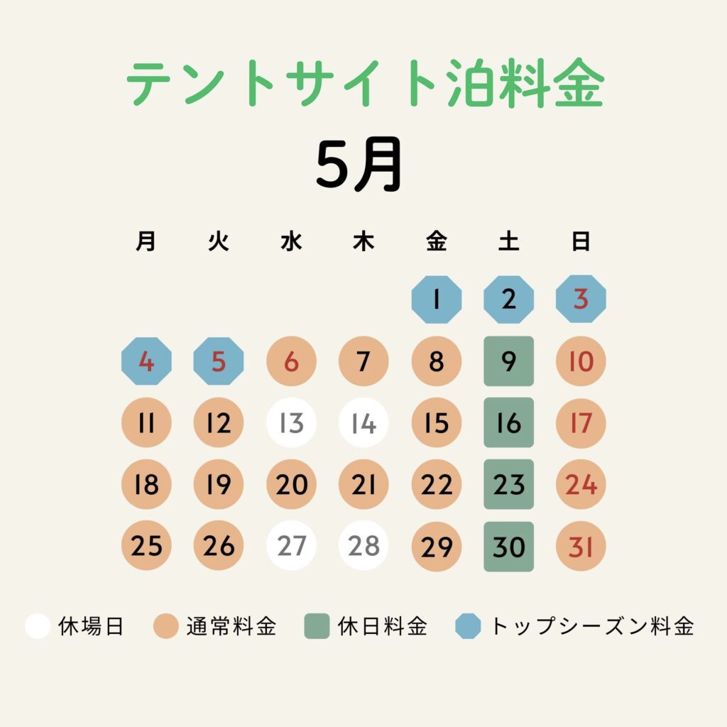 テントサイト泊料金は、日付により通常料金・休日料金・トップシーズン料金の設定がございます。