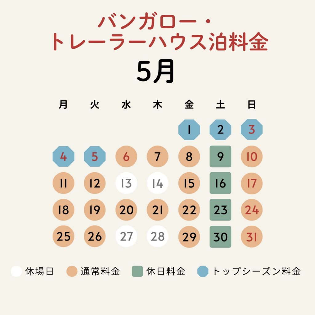 5月1日(金)、5月2日(土)、3日(日)、4日(月)、5日(火)はトップシーズン料金日となります。
